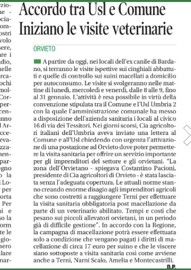 In allegato l'articolo del Corriere dell'Umbria pubblicato il giorno lunedì 19 gennaio dove si evidenzia che le richieste di Cia sono state accolte.
