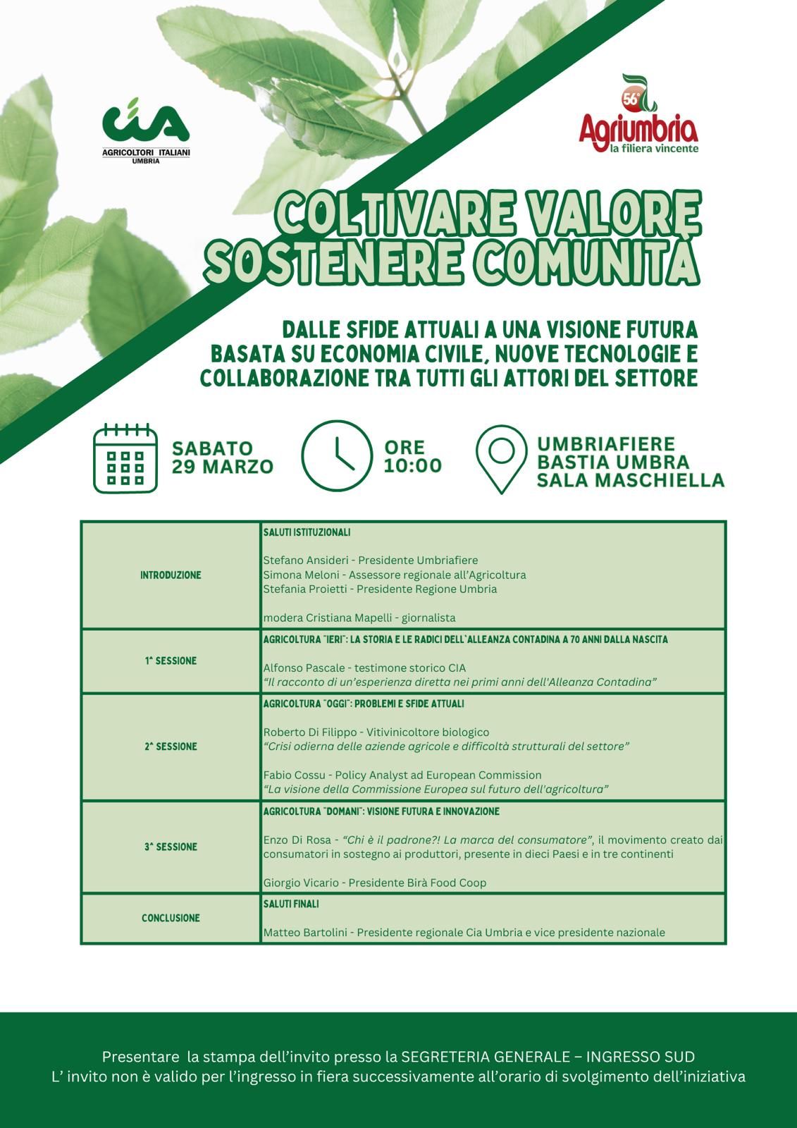 «Anche in questa edizione – ha dichiarato Matteo Bartolini, presidente di Cia Umbria e vice presidente nazionale – portiamo nuovamente in evidenza le voci degli agricoltori e presenteremo nuovi progetti e modelli di sviluppo, rispondendo alle esigenze dei territori, dei consumatori e dei piccoli agricoltori. Sfide che possono essere affrontate e risolte se c'è volontà, idee innovative e progettualità. In particolare, verranno trattati i temi delle filiere alimentari alternative, con l'introduzione di modelli economici e sociali che, da un lato, possono favorire la rigenerazione dei quartieri e delle aree interne, e dall'altro, permettono alle imprese di accedere a mercati locali».